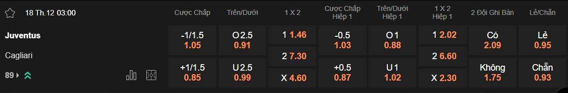 Theo tỷ lệ kèo nhà cái châu Á hôm nay, Juventus đang ở cửa trên và nhận mức chấp là 1 1/4. Như vậy, chủ nhà cần giành chiến thắng với cách biệt ít nhất 2 bàn để giúp các nhà đầu tư có lợi nhuận. Họ được dự đoán sẽ giành chiến thắng nhưng kịch bản trên vẫn khó xảy ra. Như đã đề cập, Lão bà liên tục bị cầm hòa trong thời gian qua. Về phía Cagliari, họ mới chỉ có đúng 1 thất bại với cách biệt nhiều hơn 1 bàn trên sân khách kể từ đầu mùa.