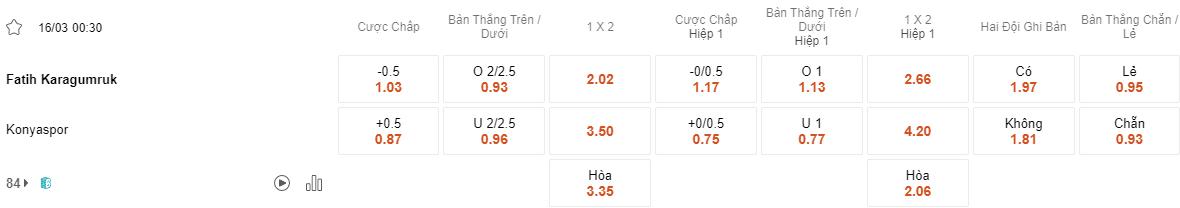 Tỷ lệ kèo Karagumruk vs Konyaspor