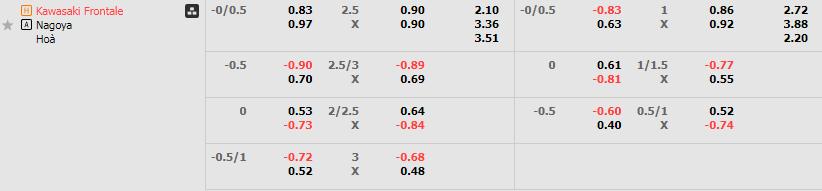Nagoya Grampus với phong độ ổn định đang nhập cuộc khá tự tin. Khi mà có 3/4 trận gần nhất, họ ghi bàn trong hiệp 1. Trong khi đó, Kawasaki Frontale lại đang không chơi phòng ngự tốt. Với việc họ đã nhận bàn thua trong hiệp 1 ở 2/3 lần ra quân gần nhất. Do đó, khả năng cao Nagoya Grampus sẽ ghi bàn dẫn trước và thắng kèo hiệp 1 trận này.
