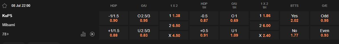 Khả năng nhập cuộc của KuPS rất ấn tượng, đặc biệt là khi được chơi tại tổ ấm. Trong 2 trận sân nhà gần nhất, họ đều có được bàn mở tỷ số trong 45 phút đầu tiên. Với sự áp đảo về thế trận, thể lực và tinh thần, KuPS nhiều khả năng sẽ sớm dồn ép Milsami ngay từ đầu và tìm được lợi thế trước giờ nghỉ. Ở chiều ngược lại, Milsami thường xuyên bị thủng lưới sớm trong các trận đấu sân khách. Họ không có khả năng kiểm soát tuyến giữa và rất dễ bị vỡ trận nếu bị pressing liên tục. Vì thế, chọn KuPS thắng hiệp 1 là quyết định khôn ngoan.