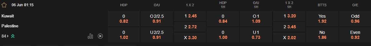 Palestine nhiều khả năng sẽ đẩy cao tốc độ trận đấu ngay từ đầu. Trong khi Kuwait đang gặp vấn đề về tâm lý mỗi khi bị ép sân. Đội bóng của HLV Abu Jazar Ehab đã thi đấu rất máu lửa trước Iraq và hoàn toàn có thể tiếp tục phong độ đó ở trận này. Sự hưng phấn sau chiến thắng gần nhất sẽ giúp Palestine nhập cuộc tự tin, và khả năng cao họ sẽ có được lợi thế trước giờ nghỉ. Ngược lại, Kuwait thường khởi đầu chậm chạp và thiếu sáng tạo ở tuyến giữa. Điều đã thể hiện trong nhiều trận gần đây. Vì vậy, Palestine thắng hiệp 1 là lựa chọn đáng tin cậy.