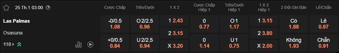Với kèo chấp đồng banh trong hiệp 1, Osasuna rõ ràng là cửa đầu tư sáng giá. Trong 6 trận gần nhất tham dự, họ chỉ có đúng 1 trận phải chịu cảnh bị dẫn bàn khi 45 phút đầu kết thúc. Las Palmas thậm chí chưa từng dẫn trước trong hiệp 1 ở 9 trận gần nhất của mình. Với hệ thống phòng ngự lỏng lẻo hiện tại, khả năng chủ nhà nhận bàn thua sớm rất cao.
