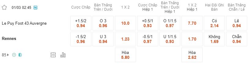 Soi kèo hiệp 1 Le Puy vs Rennes