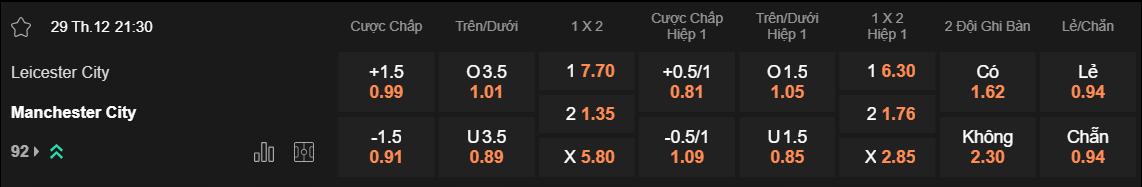 Tỷ lệ kèo Leicester vs Man City