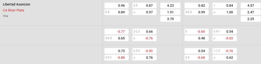Chủ nhà Libertad đang có phong độ thi đấu khá ấn tượng trong thời gian gần đây. Theo thống kê cho thấy, sau 5 trận ra quân gần nhất, họ đã giành được 4 chiến thắng. Được chơi trên sân nhà, tuy nhiên, phải tiếp đón các vị khách River Plate, đây thực sự là một thử thách khó khăn. Do đó, các chuyên gia đang đánh giá cao River Plate hơn trong trận kèo này.