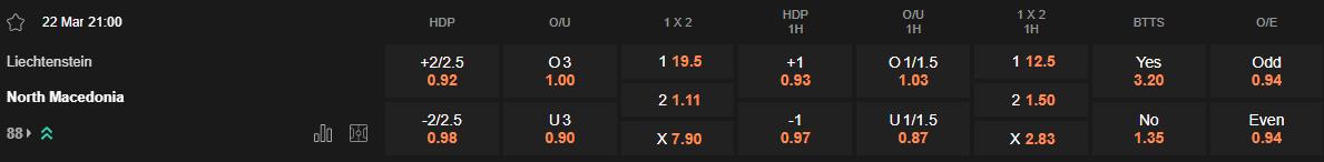 Liechtenstein có thói quen nhập cuộc khá chậm chạp, thường để đối thủ áp đảo ngay từ đầu. Trong trận đấu với San Marino, họ đã bị dẫn bàn từ rất sớm và không thể gượng dậy. Ngược lại, Bắc Macedonia chơi tấn công mạnh mẽ hơn từ những phút đầu tiên để sớm định đoạt trận đấu. Với sự chênh lệch quá lớn về đẳng cấp cũng như phong độ, khả năng Macedonia dẫn trước ngay trong hiệp 1 là rất cao.
