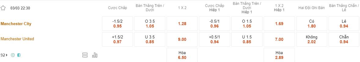 Soi kèo Man City vs MU lúc 22h30 ngày 3/3/2024