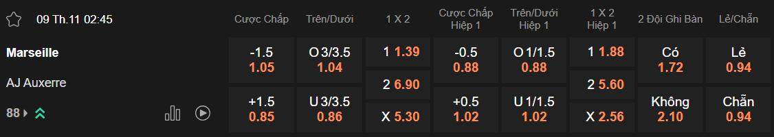 Theo tỷ lệ kèo nhà cái châu Á hôm nay, Marseille đang ở cửa trên và nhận mức chấp là 1 1/2. Như vậy, chủ nhà cần phải giành chiến thắng với cách biệt ít nhất 2 bàn để giúp các nhà đầu tư có lợi nhuận. Kịch bản này hoàn toàn có thể diễn ra. Như đã đề cập, thành tích đá sân khách của Auxerre rất tệ. Marseille có tổng cộng 6 thắng lợi tại Ligue 1 kể từ đầu mùa thì 4 trận chứng kiến họ tạo ra được cách biệt từ 2 bàn trở lên.