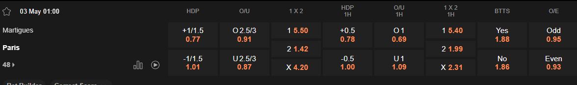 Paris FC thường nhập cuộc rất nhanh, áp sát tầm cao và tận dụng tốc độ ở hai cánh để tạo sức ép từ sớm. Họ đã ghi bàn trong hiệp 1 ở 5 trận gần nhất, và thậm chí nhiều lần vươn lên dẫn trước chỉ trong 20 phút đầu trận. Ngược lại, Martigues có xu hướng chơi bị động ở đầu mỗi hiệp và thường cần thời gian để bắt nhịp trận đấu. Khi đối đầu với các đội chơi áp đảo, họ thường để thủng lưới sớm do thiếu sự gắn kết giữa các tuyến. Với động lực cao và thói quen áp đảo từ đầu, Paris FC hoàn toàn có thể chiếm ưu thế sớm và dẫn bàn ngay trong hiệp 1.
