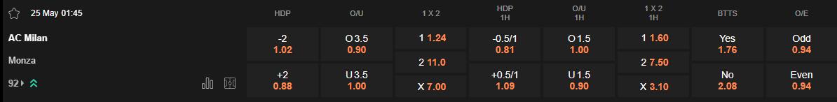 Bên kia chiến tuyến, Monza đã trải qua một trong những mùa giải tồi tệ nhất trong lịch sử Serie A. Họ mới chỉ thắng 3/37 trận, đứng chót với chỉ 18 điểm, và đã để thua tới 25 trận. Tính riêng trên sân khách, Monza đã thua 11/12 trận gần nhất và thủng lưới với tỷ lệ trung bình gần 2 bàn/trận. Với đẳng cấp vượt trội và lợi thế sân nhà, Milan hoàn toàn có thể thắng cách biệt và vượt qua kèo châu Á một cách dễ dàng.