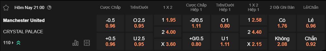 Theo tỷ lệ kèo nhà cái châu Á hôm nay, MU đang ở cửa trên và nhận mức chấp là 1/2. Với phong độ hiện tại, chủ nhà hoàn toàn đủ sức tạo ra thế trận tốt trước đối thủ. Trong 4 trận gần nhất tiếp đón Crystal Palace tại Old Trafford, Qủy đỏ chỉ nhận 1 thất bại và giành 3 chiến thắng. Độ uy tín về kèo của họ cũng đã được cải thiện rõ rệt khi thắng ở 5/7 trận gần nhất.