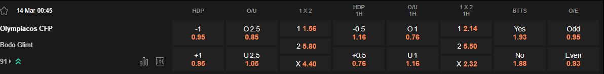 Tỷ lệ kèo Olympiakos vs Bodo Glimt