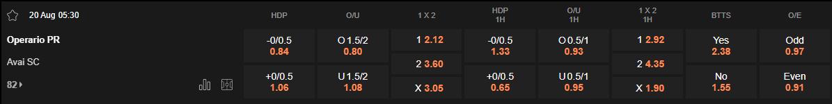 Ngược lại, Operario vừa phải nhận thất bại 1-2 trước Goias, cho thấy sự thiếu ổn định trong lối chơi. Dù có lợi thế sân nhà, nhưng Operario lại không duy trì được phong độ tốt khi gặp các đối thủ mạnh. Xét về phong độ và lối chơi, Avai đang chiếm ưu thế rõ rệt và nhiều khả năng sẽ tiếp tục duy trì mạch ấn tượng bằng một chiến thắng ngay trên sân khách.