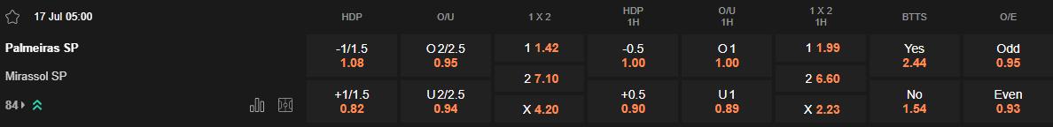 Trong bối cảnh được trở lại sau gần 6 tuần nghỉ và cần chiến thắng đậm để chứng minh tham vọng, Palmeiras chắc chắn sẽ dâng cao đội hình để tấn công ngay từ đầu. Mirassol cũng là đội không giỏi phòng ngự khi xa nhà, với việc phải nhận bàn thua trong 9/10 trận sân khách gần nhất. Đặc biệt, Palmeiras từng thắng Mirassol tới 3-2 trong lần gần nhất chạm trán. Với tình thế hiện tại, cửa Tài là phương án hợp lý, nhất là nếu Mirassol có thể góp 1 bàn danh dự. Quý vị hãy cùng đón xem tỷ lệ kèo chính xác nhất tại BONGDAINFO.