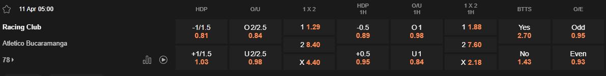 Về phía Bucaramanga, dù gây bất ngờ khi có mặt tại Copa Libertadores năm nay, nhưng đại diện Colombia vẫn còn khá “non” ở sân chơi này. Họ đã phần nào lộ rõ sự bỡ ngỡ khi bị Colo Colo cầm hòa 3-3 ngay trên sân nhà ở lượt trận đầu tiên. Phong độ sân khách của Bucaramanga tại giải quốc nội cũng không quá ấn tượng. Racing Club với đẳng cấp, lực lượng vượt trội cùng lợi thế sân nhà hoàn toàn đủ khả năng thắng kèo châu Á. Ngay cả khi mức chấp dao động từ -1.25 đến -1.5.
