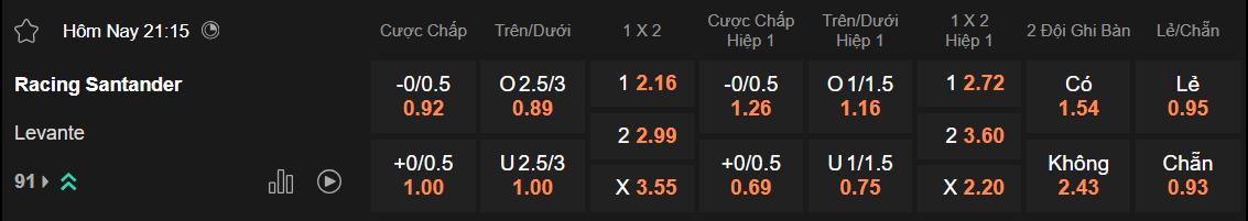 Racing Santander có thành tích đối đầu nhỉnh hơn Levante một chút (thắng 2, hòa 2 và chỉ thua 1 trong 5 lần gặp nhau gần nhất). Phong độ của đội chủ nhà cũng tốt hơn đội khách (thắng 4, thua 1 ở 5 trận gần nhất so với thắng 3, hòa 1, thua 1) nên sẽ không có gì ngạc nhiên nếu phần thắng trận này thuộc về họ. Nên với tỉ lệ kèo Racing Santander chấp 0.25 thì người chơi nên đặt cửa cho đội bóng chủ nhà thì cơ hội thắng cuộc cao hơn.