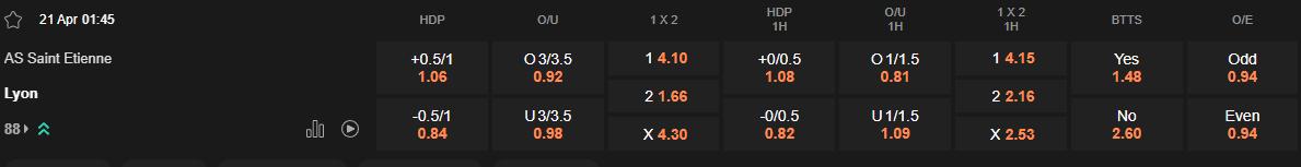 Trong giai đoạn nước rút này, Lyon luôn nhập cuộc nhanh và thi đấu quyết liệt ngay từ những phút đầu tiên. Trước một Saint-Etienne yếu thế và thường để thủng lưới sớm. Điển hình là việc họ đã nhận bàn thua chỉ sau 6 phút trước Brest tuần trước. Do đó, khả năng Lyon vươn lên từ hiệp 1 là rất cao. Ngoài ra, sự vượt trội về kiểm soát bóng, tổ chức pressing tốt từ tuyến giữa và khả năng chớp thời cơ của hàng công sẽ giúp Lyon tạo sức ép ngay sau tiếng còi khai cuộc.