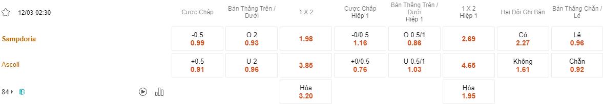 Soi kèo hiệp 1 Sampdoria vs Ascoli