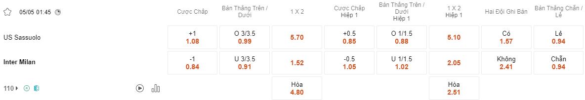 Soi kèo Sassuolo vs Inter lúc 1h45 ngày 5/5/2024