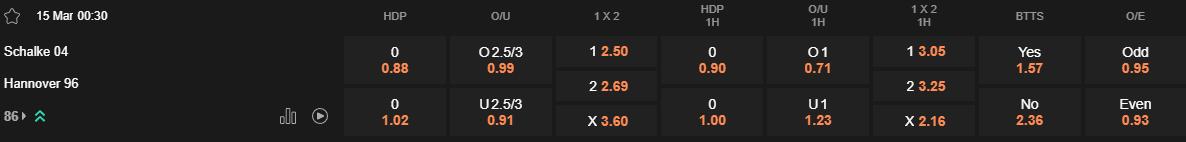 Bên kia chiến tuyến, Hannover đang phải chấp nhận cảnh phải liên tiếp chia điểm với các đội nhóm dưới. Vì thế, tỷ lệ giúp bet thủ hưởng lợi ở cửa cược của họ đang rất bết bát. Đội bóng này có lối chơi chắc chắn nhưng khá bế tắc trong khâu ghi bàn. Đặc biệt, thành tích sân khách của Hannover khá nghèo nàn khi chỉ thắng 3/12 trận xa nhà mùa này. Với phong độ hiện tại và lợi thế sân nhà, Schalke được đánh giá có cơ hội giành 3 điểm cao hơn.