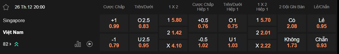 Theo tỷ lệ kèo nhà cái châu Á hôm nay, Việt Nam đang ở cửa trên và nhận mức chấp là 1. Căn cứ vào tình hình hiện tại, khả năng giành chiến thắng của đội khách rõ ràng được đánh giá cao hơn. Singapore mới chỉ bắt nạt được những đối thủ yếu và chưa để lại nhiều dấu ấn trong cách chơi. Trong khi đó, Việt Nam đang hừng hực khí thế và cũng cho thấy được sức mạnh của mình. Thêm vào đó, Những chiến binh sao vàng cũng đã giành tới 3 chiến thắng trong 4 lần gần nhất chạm trán đối thủ.