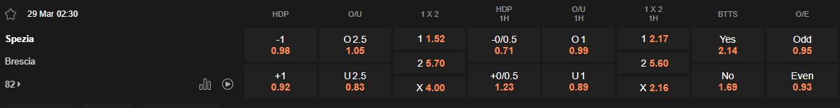 Với lợi thế sân bãi và chất lượng đội hình nhỉnh hơn, Spezia nhiều khả năng sẽ giành chiến thắng. Thành tích đối đầu cũng nghiêng về phía Spezia, khi họ đã bất bại trước Brescia 6 lần đụng độ gần nhất. Với phong độ tốt hơn và lợi thế sân nhà, Spezia có khả năng cao giành trọn 3 điểm, do đó chọn Spezia (-0.5) là lựa chọn hợp lý.
