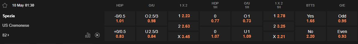 Ngược lại, Spezia đang gặp khó khăn khi phải vật lộn với ở giai đoạn cuối mùa. Phong độ của đội bóng này là rất bất ổn, khi chỉ giành được 1 chiến thắng trong 4 trận gần nhất. Đặc biệt, hàng công của Spezia đang gặp vấn đề lớn khi không thể ghi bàn trong nhiều trận đấu gần đây. Tỷ lệ thắng kèo ở cửa cược của họ chỉ vỏn vẹn 30% trong 10 lần mở kèo gần nhất.