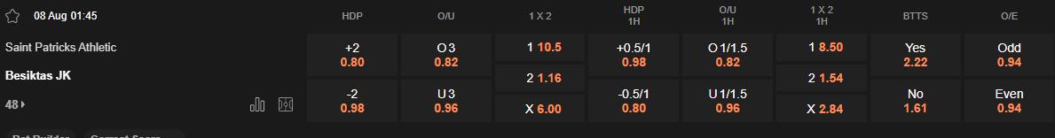 Với trình độ vượt trội, Besiktas nhiều khả năng sẽ đẩy cao đội hình ngay từ đầu để tìm bàn thắng sớm. Trong nhiều trận đấu ở cấp độ châu Âu trước các đội dưới cơ, Besiktas thường có thói quen giải quyết trận đấu trong hiệp 1 và giảm nhịp độ ở hiệp 2. St Pat’s trong khi đó thường gặp khó khi đối đầu với các đội có cường độ thi đấu cao. Trước Basaksehir mùa trước, họ cũng bị dẫn trước và không thể lật ngược thế cờ.