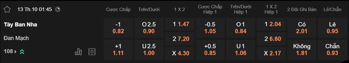 Tây Ban Nha đang ở cửa trên trong kèo hiệp 1 và chấp 1/2. Với tình hình hiện tại, họ khó lòng tạo ra được thế trận áp đảo trước đối thủ ngay sau tiếng còi khai cuộc. Chủ nhà vẫn có thể giành 3 điểm nhưng bước ngoặt nhiều khả năng sẽ chỉ đến trong hiệp 2. Cần biết rằng, Đan Mạch đã không thủng lưới bàn nào trong hiệp 1 ở 4 trận gần nhất tham dự.