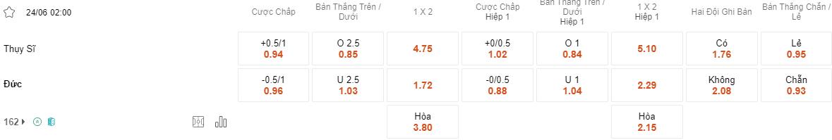 Thụy Sĩ đã không thua trong hiệp 1 ở 16 trận đấu gần nhất trên mọi mặt trận với 10 lần giúp bet thủ vượt ải. Qua đó cho thấy họ biết cách giữ vững lối chơi và tạo ra lợi thế ngay từ đầu. Dựa trên xu hướng thi đấu trên, Thụy Sĩ có khả năng tạo ra bất ngờ ngay từ hiệp 1. Với khả năng tận dụng tốt các cơ hội, Thụy Sĩ có thể gây áp lực lên hàng phòng ngự của Đức ngay từ sớm. Đức với lối chơi thăm dò và cẩn trọng có thể sẽ mất một thời gian để điều chỉnh. Đặc biệt là khi họ đã đảm bảo một suất ở vòng knock-out và có thể không mạo hiểm từ sớm.