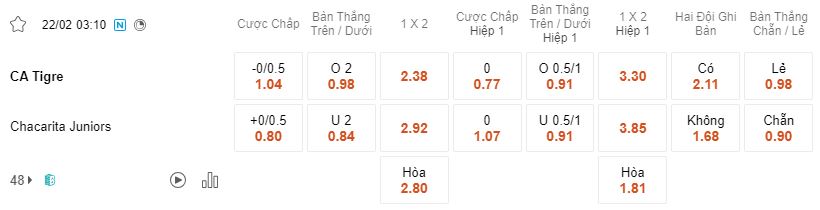 Cả hai đội đều có lịch sử thi đấu với chiến thuật cầu thủ phòng ngự chắc chắn, và dựa vào sự kém hiệu quả trong việc ghi bàn của Tigre và sự cân nhắc của Chacarita trong phòng ngự, khả năng trận đấu kết thúc với tỷ số thấp hoặc không nhiều bàn thắng được ghi là khá cao. Do đó, tùy chọn Xỉu có thể là một lựa chọn hợp lý trong trận đấu này. Tỷ lệ kèo sẽ liên tục được cập nhật trên Bongdainfoz.net, quý vị hãy cùng đón xem.