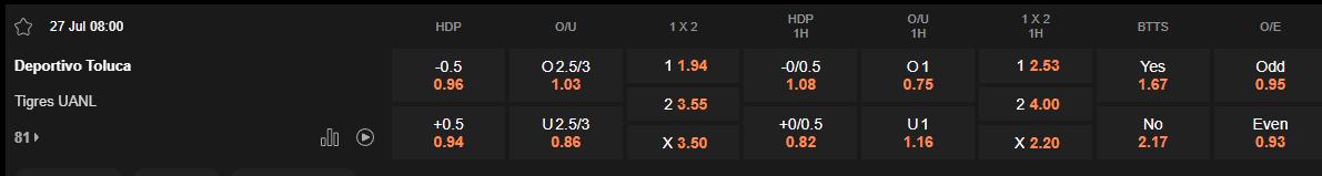 Soi kèo châu Á Toluca vs Tigres