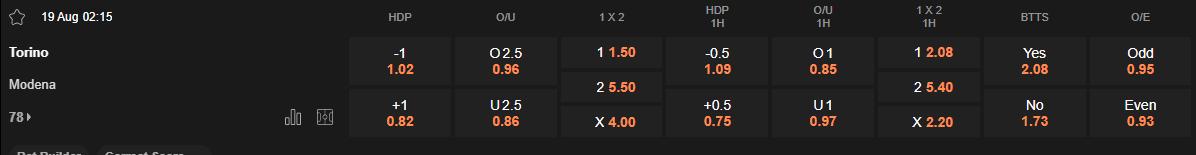 Soi kèo Torino vs Modena lúc 2h15 ngày 19/8/2025