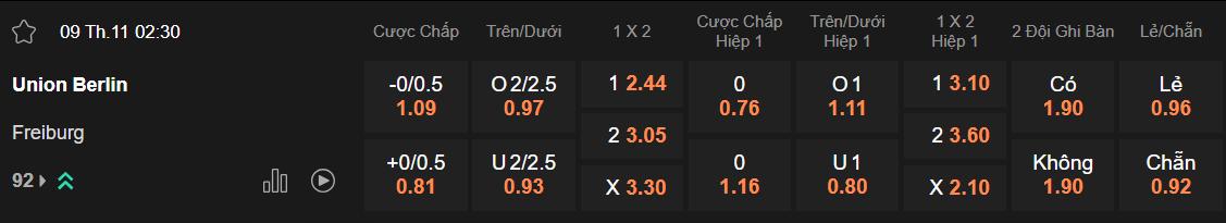 Hiệp 1 của trận đấu này đang có kèo đồng banh. Như vậy, khả năng chiến thắng về mặt lý thuyết được chia đều cho 2 đội. Union Berlin có điểm tựa sân nhà. Tại đây, họ đã luôn là bên mở tỷ số và duy trì được thế dẫn bàn ở hiệp 1 trong 3/4 trận gần nhất. Freiburg chỉ ghi được 1 bàn trong 4 chuyến hành quân gần nhất tính ở 45 phút đầu. Chủ nhà rõ ràng là phương án đầu tư hợp lý hơn.