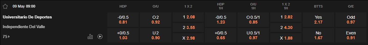 Ở chiều ngược lại, Independiente del Valle hiện không còn giữ được sự khó chịu như trước. Phong độ sân khách của đại diện Ecuador là rất đáng báo động. Họ đã không thắng trong trận xa nhà gần nhất ở lượt đi. Mỗi lần rời xa sân nhà, hàng thủ của họ thường xuyên mắc sai lầm, đặc biệt ở khâu chống bóng bổng và kèm người trong vòng cấm. Với tỷ lệ chấp được dự đoán là đồng banh hoặc -0.25 cho Universitario, lựa chọn đội chủ nhà là phương án khả dĩ.