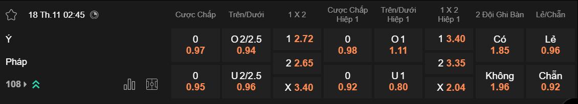 Theo tỷ lệ kèo nhà cái châu Á hôm nay, hai đội đang được đánh giá ngang nhau. Căn cứ vào tình hình hiện tại, khả năng có điểm của Ý trong trận này rõ ràng được đánh giá rất cao. Họ vừa duy trì được phong độ tốt lại vừa hưởng điểm tựa sân nhà. Pháp thực tế cũng đã chắc chắn giành vé đi tiếp nên động lực thi đấu không còn quá mạnh mẽ.