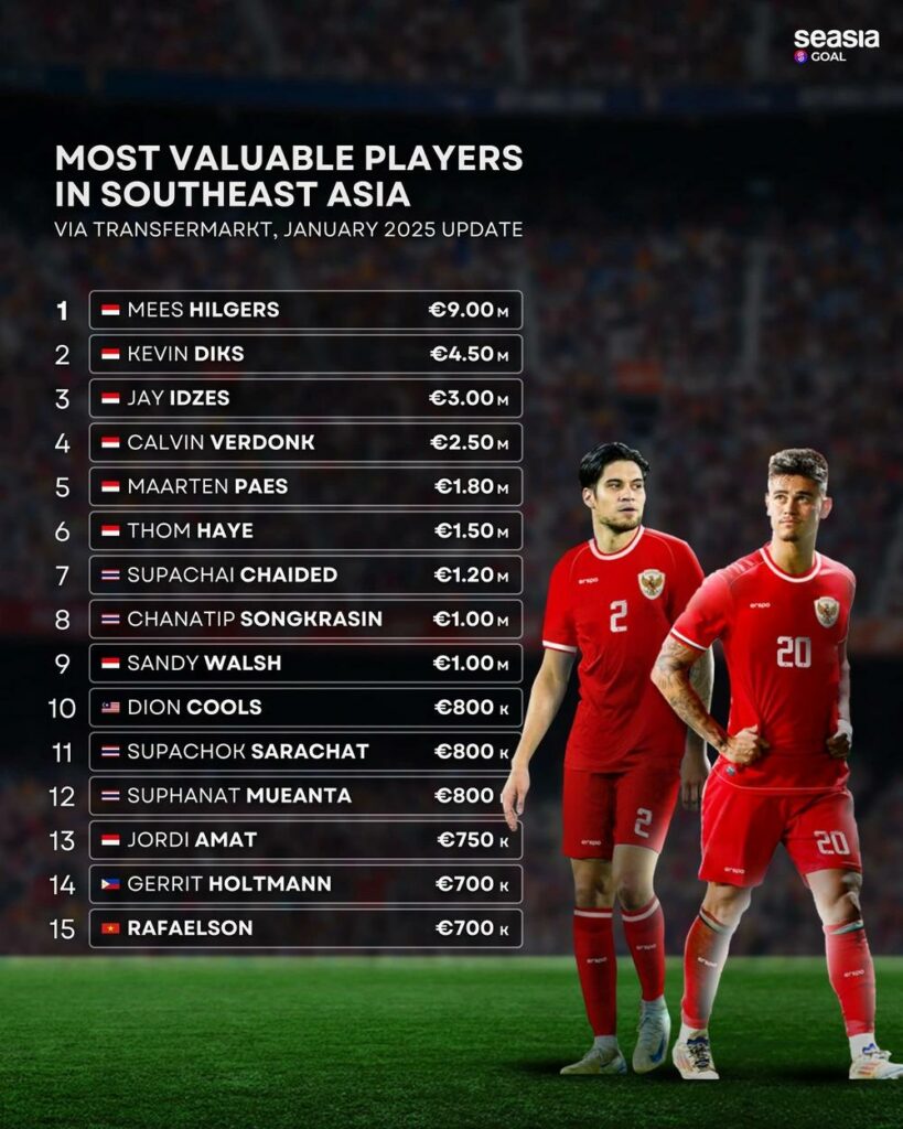 Trên toàn khu vực, trung vệ nhập tịch Mees Hilgers của Indonesia đứng đầu danh sách với mức giá 9 triệu euro. Điều này cho thấy khoảng cách ngày càng lớn giữa các cầu thủ bản địa Đông Nam Á và những ngôi sao nhập tịch đang thi đấu tại các giải đấu lớn.