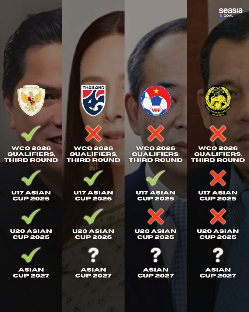 Trong khi đó, Thái Lan dù có những thành công nhất định ở cấp độ U17 khi giành ngôi đầu bảng, nhưng lại không thể tạo nên bất ngờ ở cấp độ U20. Việt Nam cũng gặp khó khăn khi U20 Việt Nam không thể vượt qua vòng loại U20 châu Á 2025 dù được thi đấu trên sân nhà.
