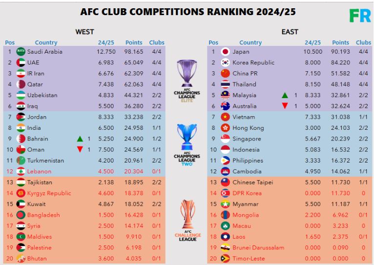 Trong bảng xếp hạng mới nhất của Footy Ranking về các CLB châu Á khu vực phía Đông mùa giải 2024/25, bóng đá Việt Nam đã có một bước tiến đáng kể khi vươn lên vị trí thứ 7. Thành tích này là nhờ vào màn trình diễn ấn tượng của CLB Nam Định tại AFC Champions League Two.